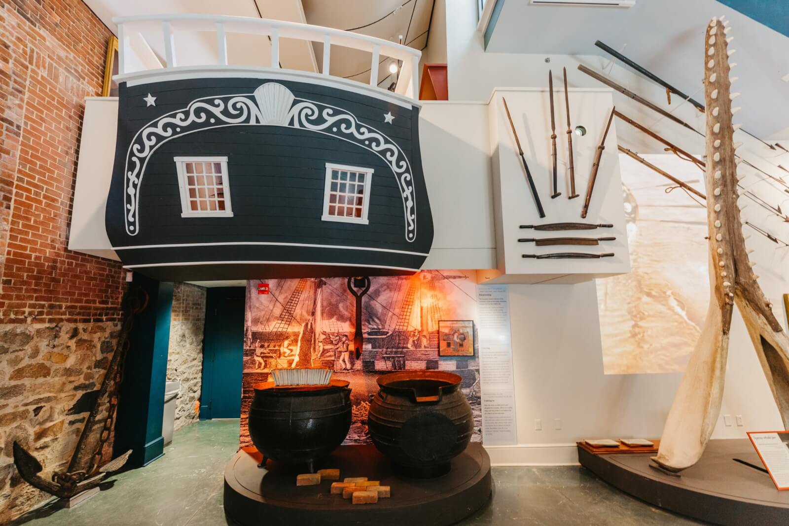 Anchored beneath the dramatic whale skeleton the diminutive 28-foot whaleboat evinces the dangers of hunting the largest creatures on earth. Ours is a whaling-era boat, built in the late 19th-century in New Bedford. Whaleboats were built to be light, fast and maneuverable. The boat is equipped for efficient sailing, with a tabernacle to raise a mast and a centerboard. The boat also contains the equipment typically carried in American whaleboats, with tubs of coiled line, harpoons, lances, piggin (bailing bucket), drogue, and a hatchet to cut the line if the whale sounds deeper than the line can go.