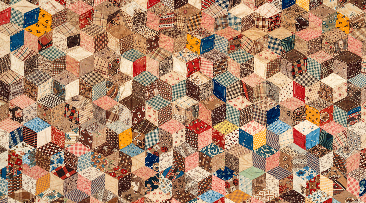 Banner Image: Unfinished patchwork quilt, mid-19th century. Printed cotton, paper (recycled letters and playing cards). Donor unidentified, 1985.46.1.