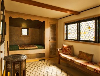 The house was originally built around 1790 as a livestock barn. The sisters discovered the building in 1929 when they followed a herd of cattle up Main Street. Enthralled, they purchased it and set about transforming it into their summer retreat, adorning it with salvaged architectural elements, decorative objects, and eclectic furniture. Their personal aesthetic blended art and whimsy with an appreciation of the handcrafted—whether woven, carved, forged, or painted—creating a strongly expressive environment suited to their tastes.